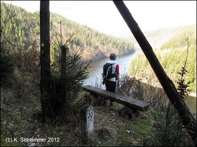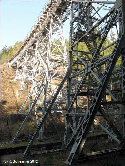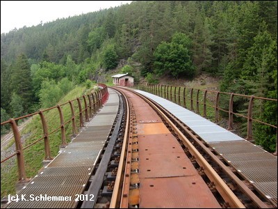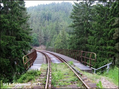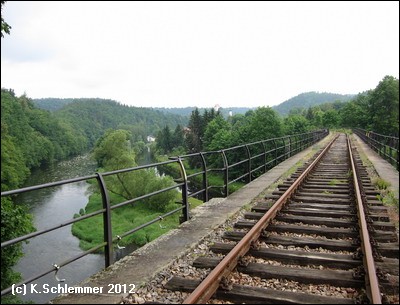 Die Fahrt führt durch eine einsame Waldlandschaft abseits des motorisierten Verkehrs. Von der hoch am Hang verlaufenden Bahnstrecke aus hat man stellenweise einen atemberaubenden Blick weit hinab ins Saaletal und den Beginn des Aufstaus der Talsperre Hohenwarte. Der Stopp an der Ziemestalbrücke ist ein Muss. An dem eigenwilligen Bauwerk wird deutlich, was die Ingenieurskunst vergangener Zeiten zustande gebracht hat. Zwischen 1893 und 1895 entstand das 115 m lange und 35 m hohe Viadukt aus vernieteten Stahlträgern. 10 Pfeiler tragen die Konstruktion, die das Tal in einer langegezogenen Kurve überbrückt. Von der Ferne aus wirkt die filigrane Konstruktion wie aus Streichhölzern erbaut. Der Blick auf die Burgruine Wysburg aus dem 11. Jahrhundert war vom Viadukt aus 2012 leider wegen des starken Bewuchses nicht möglich.
