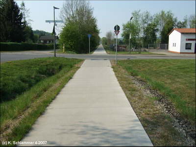 Beginn des Radwegs auf der Trasse an der B 27 in Gieboldehausen. Die üblichen Sperren, viel zu nahe an der Straße, eine Verkehrsinsel soll das Überqueren der gefährlichen Bundesstraße erleichtern.