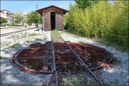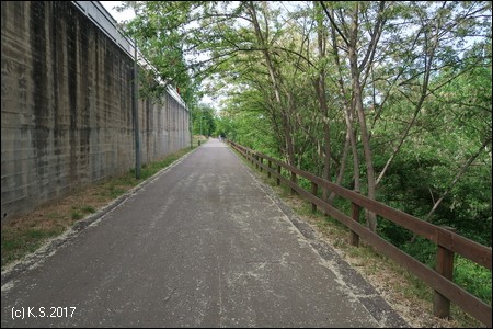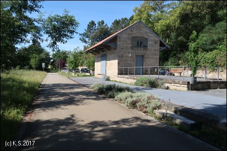 Ein schmaler Weg führt auf dem ehemaligen Gleisbett zum Beginn der Fahrradstrecke, die Reste der alten Drehscheibe verschwinden langsam in der Vegetation. Am 30.April 2011 wurde dieser Abschnitt eröffnet, steht auf der Tafel.