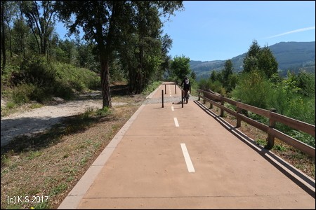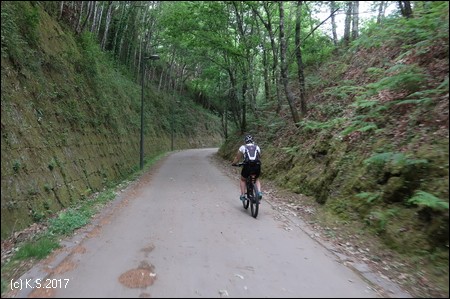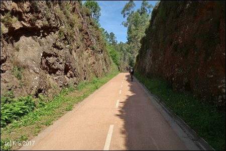 Einschnitt durch die rötlichen Felsen, ein Radweg vom Feinsten, gut gepflegt!