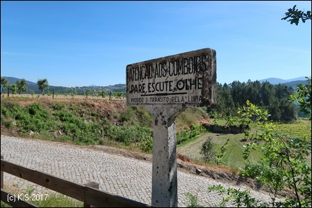 Nun steigt die Strecke wieder an, führt leicht aufwärts durch Einschnitte und vorbei an den Weinbergen. An den Querwegen stehen die alten Warnschilder: Vorsicht, Zugverkehr! Halte an, höre und schaue!