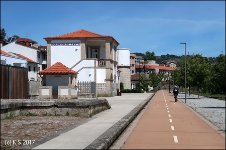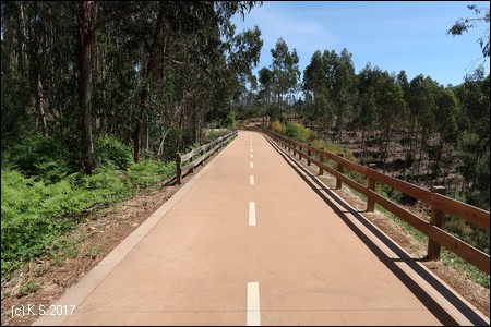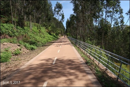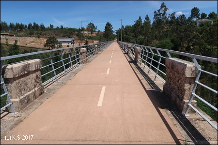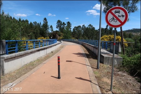 An der nächsten großen Brücke (Ponte do Barreirinho) beginnt wieder der Fahrbahnausbau. Die Brücke mit zwei Natursteinpfeilern und einem Träger aus Beton hat ein neues Geländer bekommen. Die rote Fahrbahn sieht sauber und gepflegt aus. Leider behindern zwei Pfostensperren in der Fahrbahn die Radler.