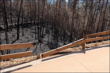 Stabile Metallgeländer - ein eindeutiger Vorteil, denn nur ein wenig weiter hat ein Waldbrand gewütet.