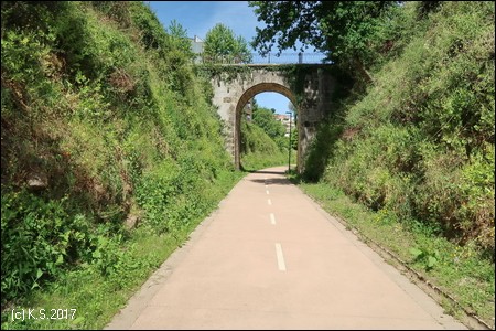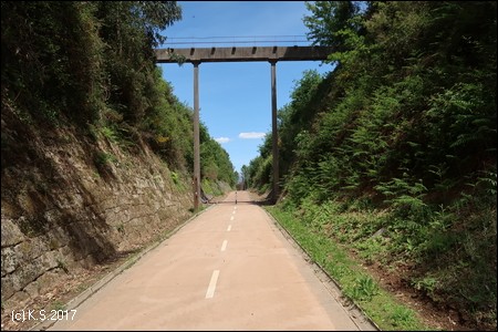 Am Hang entlang durch den Grüngürtel geht es mit moderater Steigung von ca. 3% bergauf, der Radweg knickt nun Richtung Osten ab. Schon ist das Westportal des einzigen Tunnels der ehemaligen Bahnlinie erreicht.