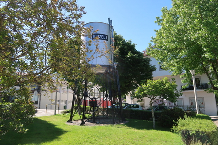 Auf kleinen Straßen geht es innerorts hinab, knapp 2 km bis zum ehemaligen Bahnhofsgelände. Auf dem Grünstreifen am Kreisverkehr steht der alte Wasserhälter für die Dampfloks verloren zwischen dem quirligen Autoverkehr der N 2. Dort beginnt die Ecopista do Dão auf der stillgelegten Bahnstrecke nach Santa Comba Dão.