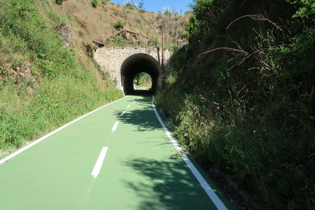 Der Radweg ist auch nach der Straßenüberquerung grün asphaltiert, durch den 25 m kurzen Tunnel Lamas geht es zügig bergab. Etwa 3,2 Km vom Bahnhof Vouzela entfernt, nahe Termas de Sao Pedro, wechselt der Asphalt auf die Farbe rot.