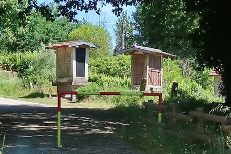 Weiter in östlicher Richtung. Schon bald endet der Asphalt. Hinter einer der neuen, kantigen Sperren stehen zwei schöne Kornspeicher am Wegesrand.