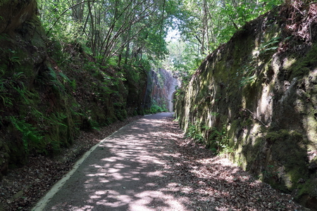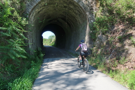 Hinter der Kurve wartet schon der nächste Tunnel, mit 60 m der längste dieses Radwegs. Die Trasse hat nun schon merklich an Höhe gewonnen und führt durch eine Waldlandschaft, geprägt von Eukalyptusbäumen.