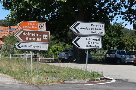 Durch den Ort Abraveses, geradeaus über die Kreuzung mit der N16 (Blick zurück) und ständig leicht bergab nach Viseu.