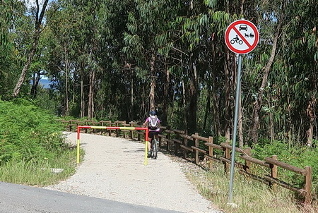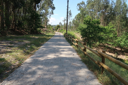 Die Bahntrasse verläuft nun direkt neben der Straße. Doch schon bald zweigt die Ecopista von der N16 nach links ab und führt durch ein Waldgebiet Richtung Arcozelo.