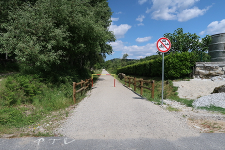 Zur Erinnerung an die Bahnstrecke hat man ein altes Gleis aufgestellt. Die Asphaltfahrbahn ist nun zu Ende. Eine lange Höhenschleife hat begonnen und überwindet auf 5 km etwa 100 Höhenmeter hinauf in die Berge. Auf dem einst schmalen, fast zugewachsenen Pfad (2017) ....