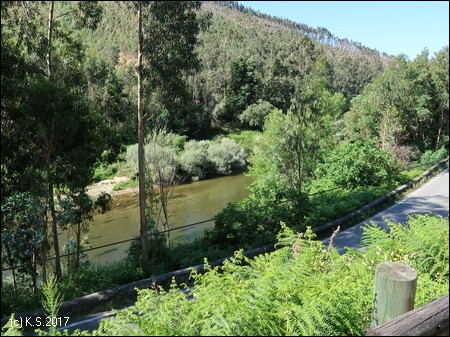 Direkt im Anschluss leitet die Brücke von Negrelos über den Rio Vouga die nächste Kehrschleife ein, denn nun geht es wieder hinauf in die Berge. Hier endet auch schon wieder der Ausbau des Radwegs (Blick zurück).