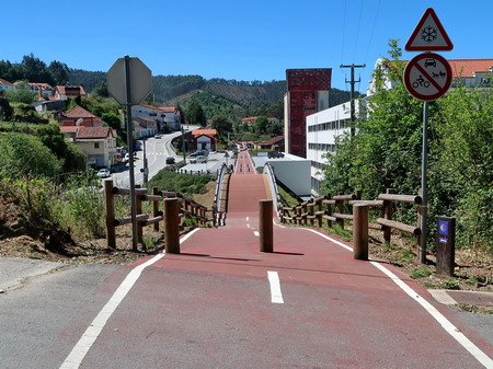 Durch die Straßenführung ist die Bahntrasse unterbrochen und muss umfahren werden. Ein unfertiger Holzsteg (Stand Mai 2023) auf beiden Seiten verspricht baldige Besserung. Nach der Umfahrung mit einem steilen Abschnitt (ca. 300 m) erreicht man wieder den Weg auf der Trasse. In zwei großen Schleifen geht es auf Asphalt hinab zum Tal des Rio Vouga.
