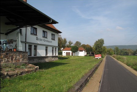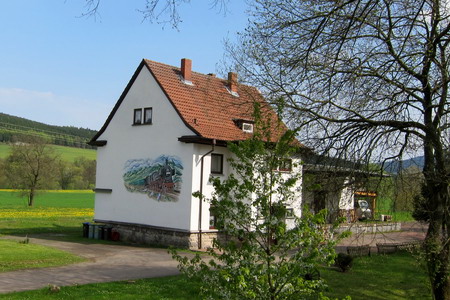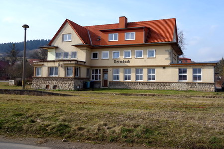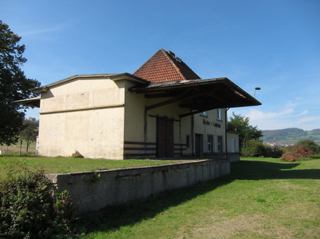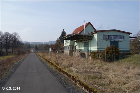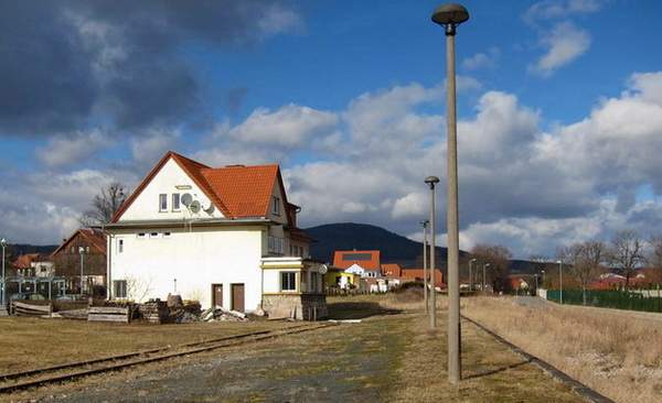 Das Bahnhofsgebäude dient als Wohnhaus. Schnurgerade weiter auf neuem Asphalt, die Berge der Rhön rücken heran.