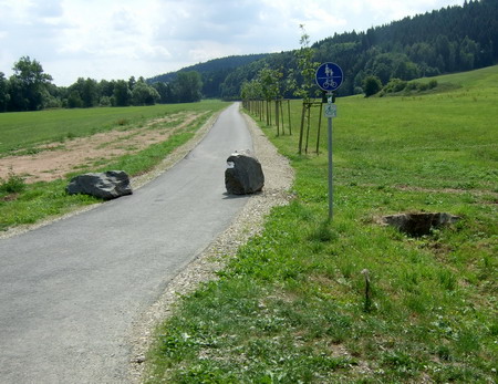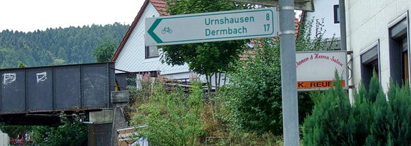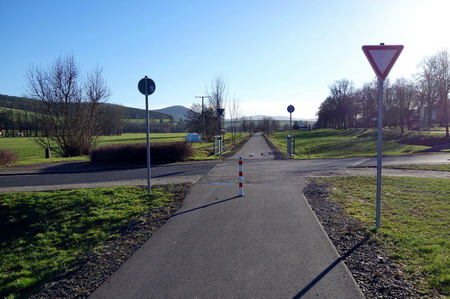 Der Radweg auf der Bahntrasse endet hier. Die Beschilderung des Feldtalradwegs führt die Radler weiter nach Kaltensundheim.