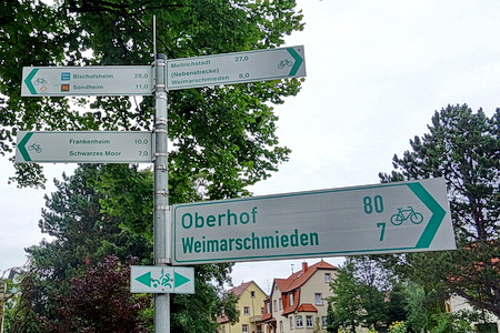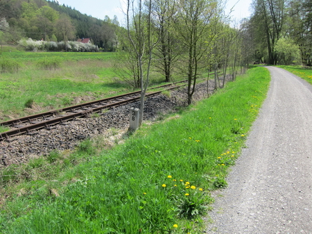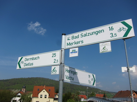Am Ortsende steht ein Wegweiser nach Stadtlengsfeld: rechts abbiegen! Der Weg an den Gleisen entlang ist nicht asphaltiert.