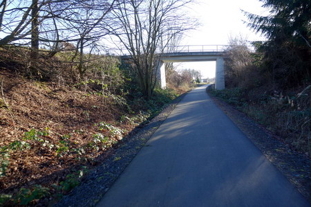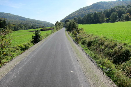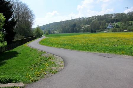 Kerzengerade geht es auf asphaltiertem Weg durch die Wiesen entlang der stillgelegten Trasse.