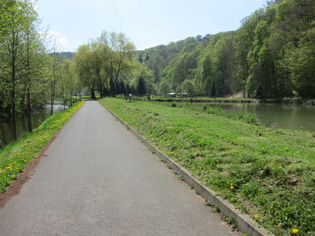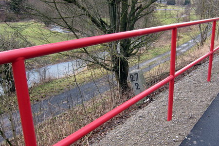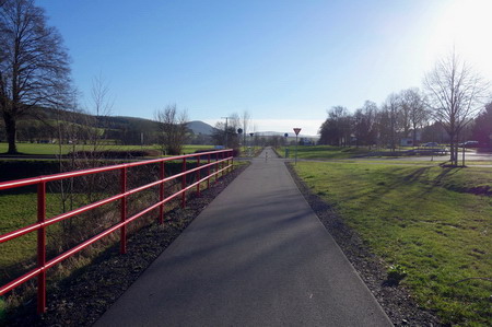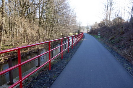 Rote Geländer trennen den Radweg vom Fluss. Es geht kerzengerade zum Bahnhof Weilar-Urnshausen.