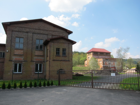 Am ehemaligen Haltepunkt Menzengraben dann zwei Poller, es geht auf die Straße hinauf und rechts ab. Wir erreichen den alten Kalischacht Menzengraben.