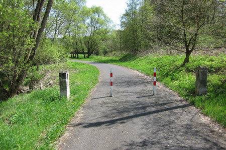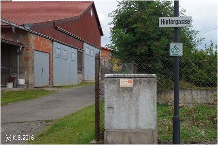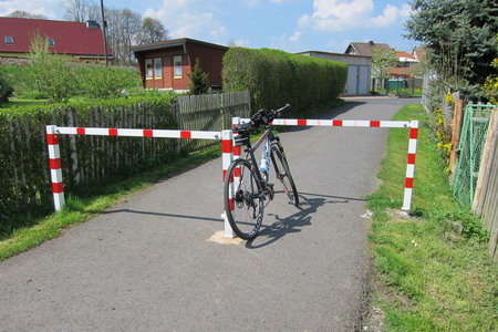In Stadtlengsfeld muss die L1022 überquert werden: geradaus in die kleine Gasse dem Wegweiser folgen. Dieses kurze Wegstück ist inzwischen auch asphaltiert. Kurz darauf das erste Hindernis: zwei engstehende kantige Drängelgitter (2013).
