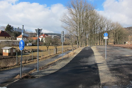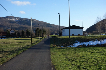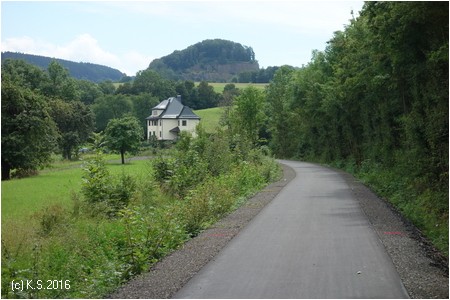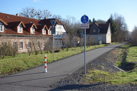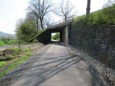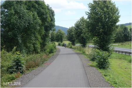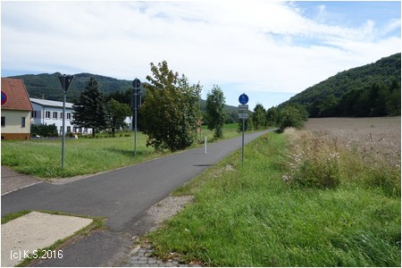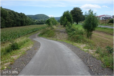 Nach der Straßenkreuzung am Bahnhof Zella wurde 2017 der Radweg auf der Trasse fertiggestellt. Rechts oberhalb am Hang liegt der Ort Zella mit der Probstei und der Kirche.
