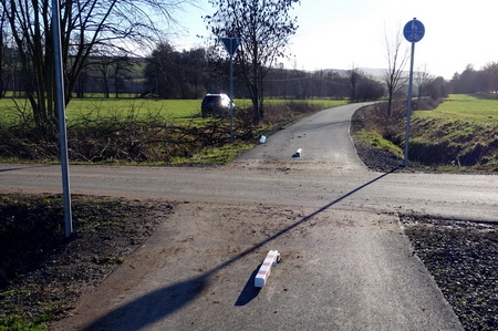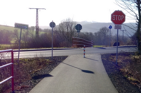 An der Straßenkreuzung wieder Pfostensperren, die bei Bedarf umgeklappt werden und als gefährliches Hindernis auf der Fahrbahn liegen. Als nächstes erreicht man den Bahnhof Weilar-Urnshausen.