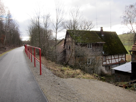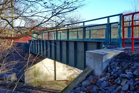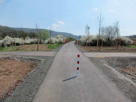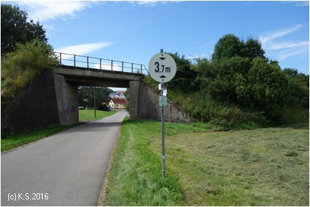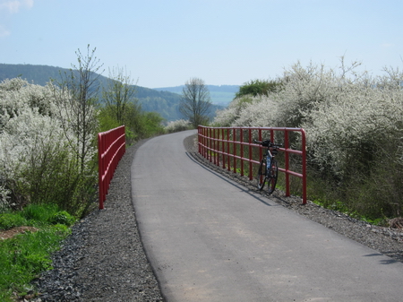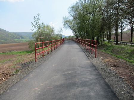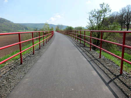 Der Radweg folgt weiter der Trasse und der Felda aufwärts. Rote Geländer begrenzen den Radweg an den steilen Flanken. Leider gibt es auch hier wieder Pfostensperren. Die Brücke über die Felda wurde von Grund auf erneuert.