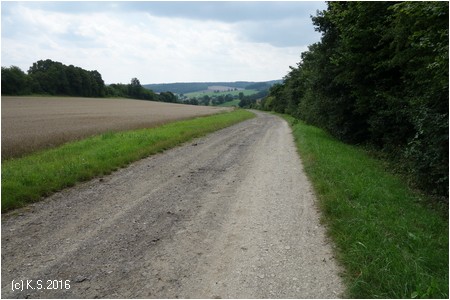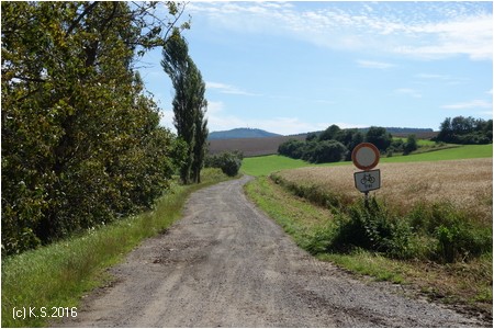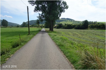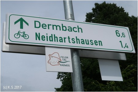Am südlichen Ortsende von Kaltensundheim stehen wieder Wegweiser. Über die Brücke, dann auf einem Feldweg links den Berg hinauf.