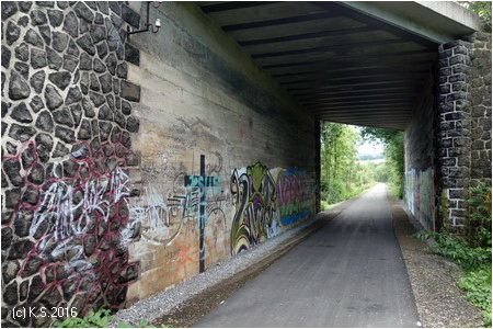 Unter der Bundesstraße 285 durch, die Betonwände verziert mit Graffitti.