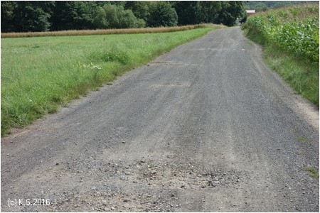 Vorbei am Sportlerheim. Hier endet wieder der Asphalt: Schlaglöcher vom Feinsten (Stand 2016)