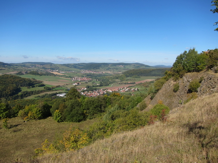 Wer den Aufstieg auf den erloschenen Vulkan wagt, blickt weit in das Feldatal hinab. Von hier aus verband eine Seilbahn den Basalt-Steinbruch mit der Bahnstrecke. Die Reste der technischen Anlagen kann man im Dickicht versteckt noch am Rand der Trasse finden.