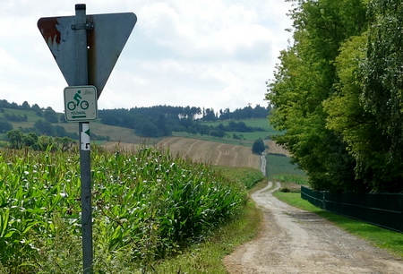 Über die Kuppe, dann geht es wieder bergab nach Schafhausen. Auch hier findet man die kleinen Wegweiser des Radwegs.