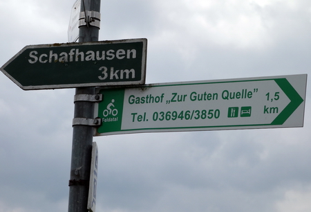 Der Wegweiser des Feldatalradwegs zeigt zurück zum Gasthof. Der Ort liegt unten im Tal.