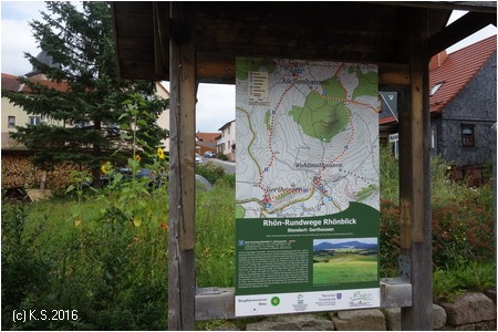 Infotafel und Beschilderung im Ort: rechts abbiegen (noch ca. 9 km nach Fladungen). Knapp 2 km weiter überquert man die Landesgrenze zwischen Bayern und Thüringen. Hier befand sich einst die innerdeutsche Grenze!