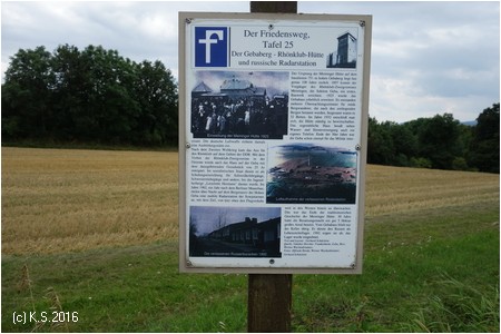 Hinter Brüchs steigt der Weg kräftig an, hinauf bis auf etwa 580 m ü.NN. In dieser Region befinden sich die höchsten Berge der Vorderen Rhön (Gebaberg, 750,7 m ü. NN). Die Tafeln des "Friedenswegs" erinnern an die ehemalige Grenze. Dieser steile "Abstecher" lässt sich durch die Fahrt auf der Kreisstraße NES31 vermeiden (Vorsicht, Autoverkehr).