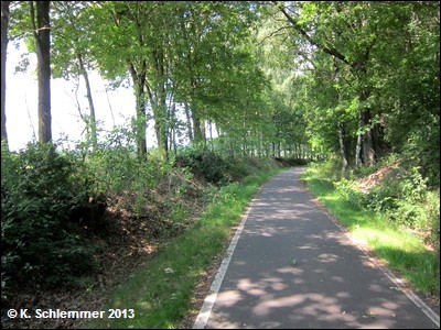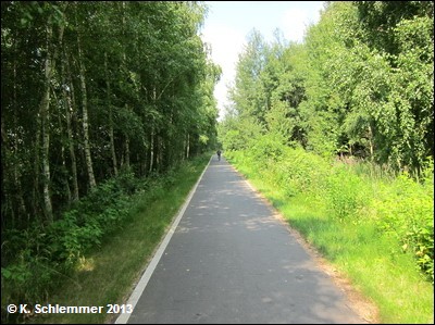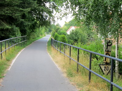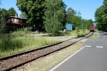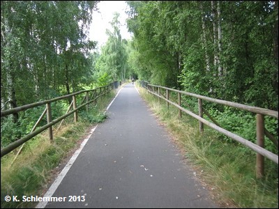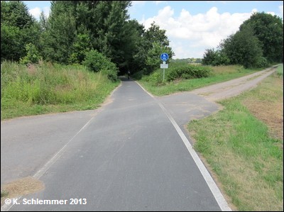 Noch vor der B6 kreuzt die Bahnlinie nach Cottbus, hier zweigte die Görlitzer in westlicher Richtung ab. Nach 600 m Radweg, unter der B6 hindurch, erreicht man den Beginn des schön ausgebauten Radwegs auf der Trasse.