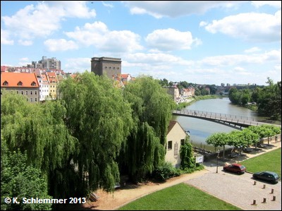 Von der Altstadtbrücke aus, mit Blick über die polnische Grenze zur Dreiradenmühle, folgen wir eines kurzes Stück der Lausitzer Neiße flußabwärts (Blick zurück).