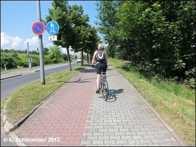 Dann verlassen wir den Neiße-Radweg und fahren am Nikolaifriedhof vorbei. An der Schlesischen Straße treffen wir auf den ersten Wegweiser zum Kreisbahnradweg. Ab hier ist es gut beschildert!