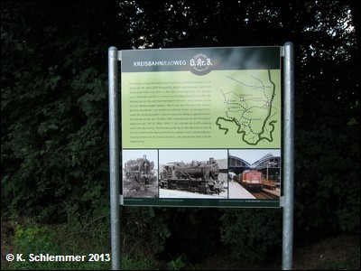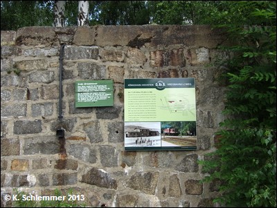 Ein Schild erzählt die Geschichte des Bahnhofs. Es folgt eine Brücke über das "Königshainer Wasser".