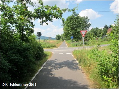 Straßenkreuzung ohne Pfosten (Vorfahrt achten!). Normgerechte Beschilderung: hier geht es ab zum Froschradweg.