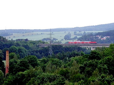 Richtung Südwesten: Ein Regionalzug auf der neuen Betonbrücke über das Flöhatal