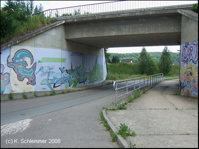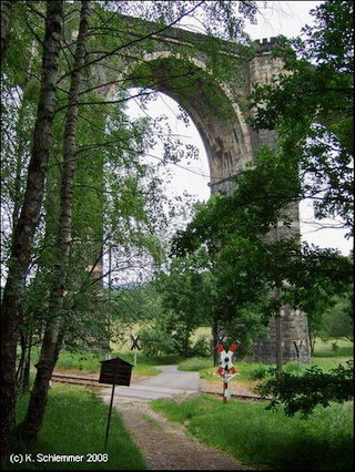 Am einfachsten kommt man auf den Wanderweg zum Viadukt von Falkenau aus: am südlichen Ortsende unter der Bahnlinie durch......