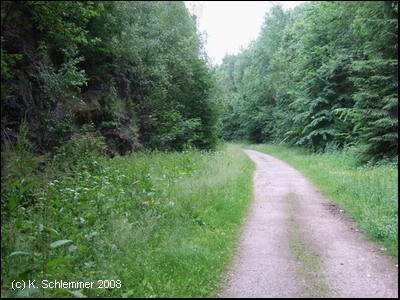 Nur einen Kilometer weiter trifft man auf das Ende der Strecke: entlang der jetzigen Bahnlinie geht es abwärts ins Tal Richtung Straße.