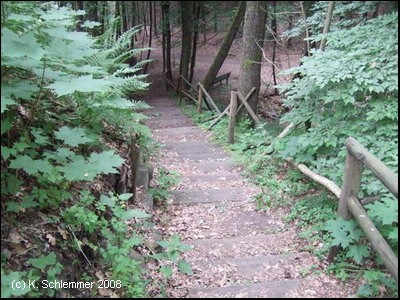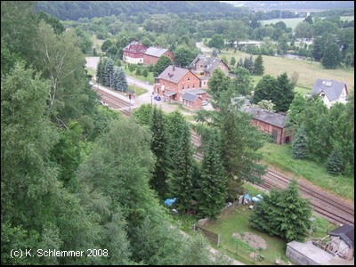 Von hier aus führt eine Treppe mit morschem Geländer hinab ins Tal und zum Bahnhof Hetzdorf.