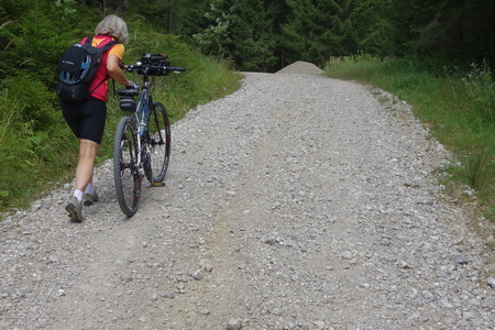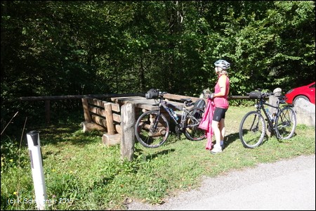 Hier beginnt der Anstieg zum Hirschkogelsattel, eine Strecke, die nach unserer Ansicht nicht familienfreundlich ist. Es geht auf rutschiger Splitt/Schotterpiste kräftig bergauf, für einige Radler ist hier Schieben angesagt. Auch die steile Abfahrt hinab nach Brunnbach ist auf der ruppigenFahrbahn nicht ganz ungefährlich.