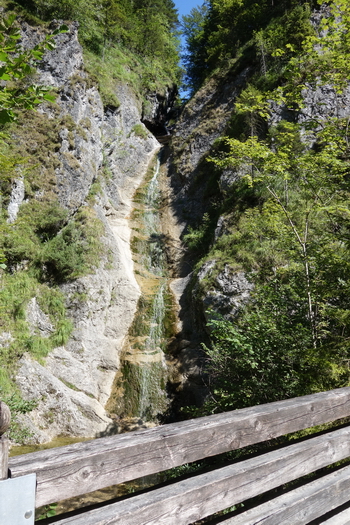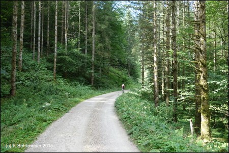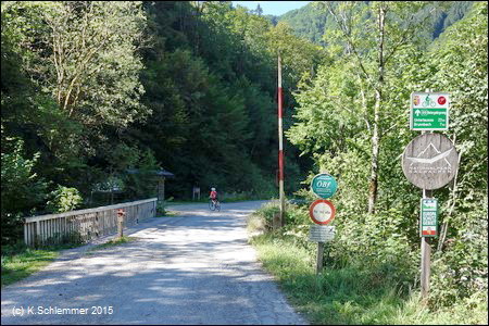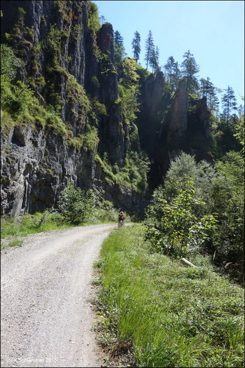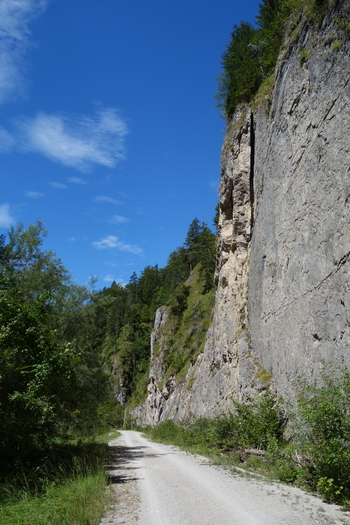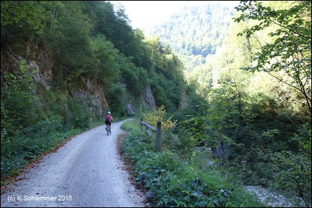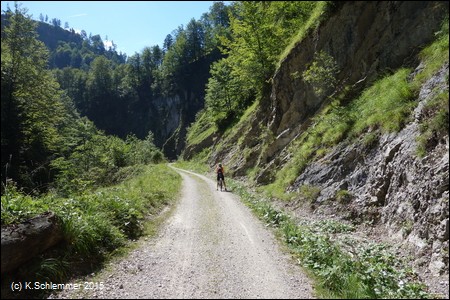 Schließlich erreicht man den "Schleierfall". Steile Felswände ragen neben dem Radweg auf (Blick zurück).