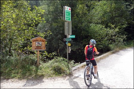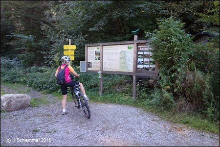 Wir beginnen die Fahrt an einem kleinen Parkplatz am Ortsausgang von Reichraming. Dort, am Reichramingbach, befinden sich Infotafeln zum Radweg.