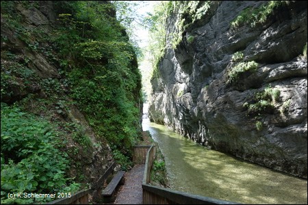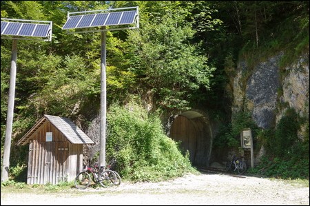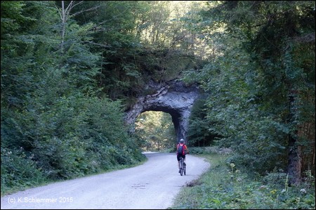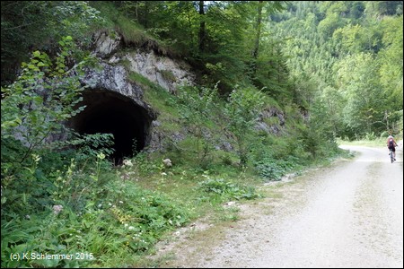 Der Bach zwängt sich durch die Felsen....und die Radler durch den beleuchteten Tunnel. Dann öffnet sich die Schlucht.