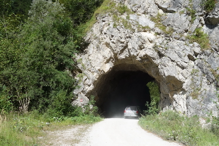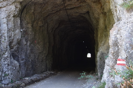 Achtung, Gegenverkehr! Auch in den (teils spärlich) beleuchteten Tunneln Licht einschalten! Nun führt der Weg stetig aufwärts durch den Wald....