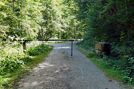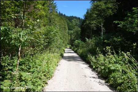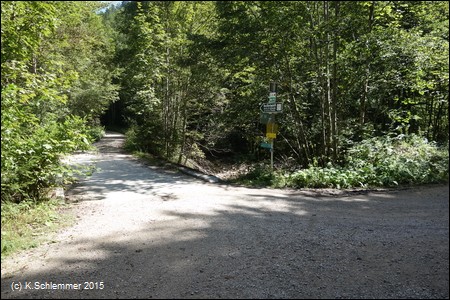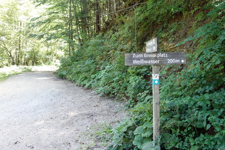 An der Schranke am Abzweig 200 m vor dem Biwakplatz Weißwasser zeigen die Wegweiser nach links zum Hirschkogelsattel (4,3 km)